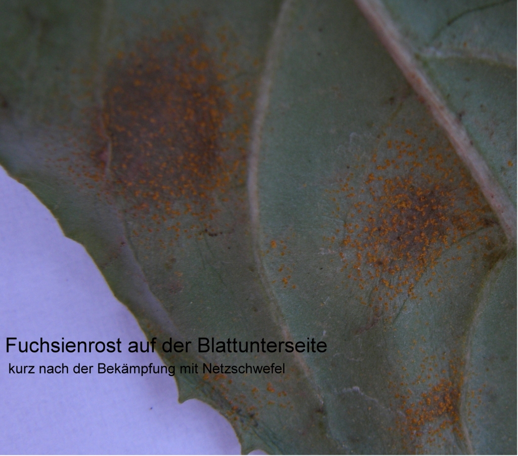 Im Anfangsstadium lässt sich Fuchsienrost noch leicht bekämpfen mit fungicider Spritzung. Befallene Blätter sollte man im Hausmüll entsorgen. Wir haben bei Befallsbeginn Netzschwefel gespritzt, wie er z.B. gegen Mehltau verwendet wird. Das bekämpft zwar nicht den Befall, kann aber die Ausbreitung behindern.
